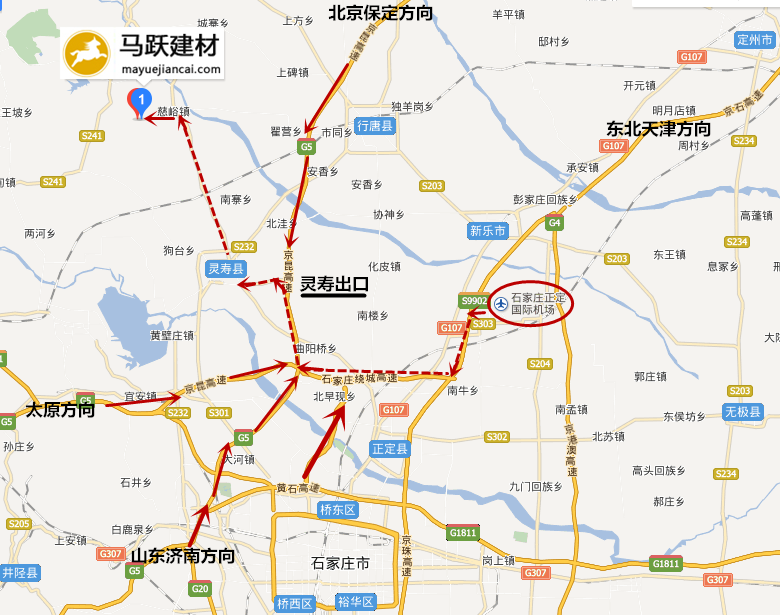 1、北京(京昆高速)—靈壽縣城—慈峪鎮—馬躍建材